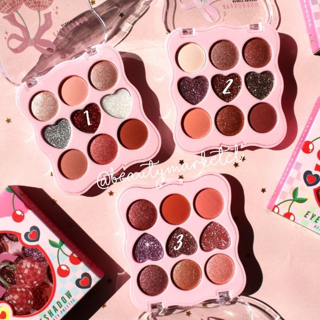 Mini Paleta de Sombras Cherry, excelente pigmentación con 9 tonos: matte, brillantes y glitter, ideal para llevar en el cosmetiquero.