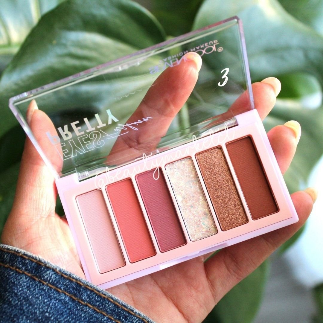 Mini Paleta de Sombras Pretty, 6 tonos matte, brillante y glitter con preciosa pigmentación, ideal para llevar en el cosmetiquero.