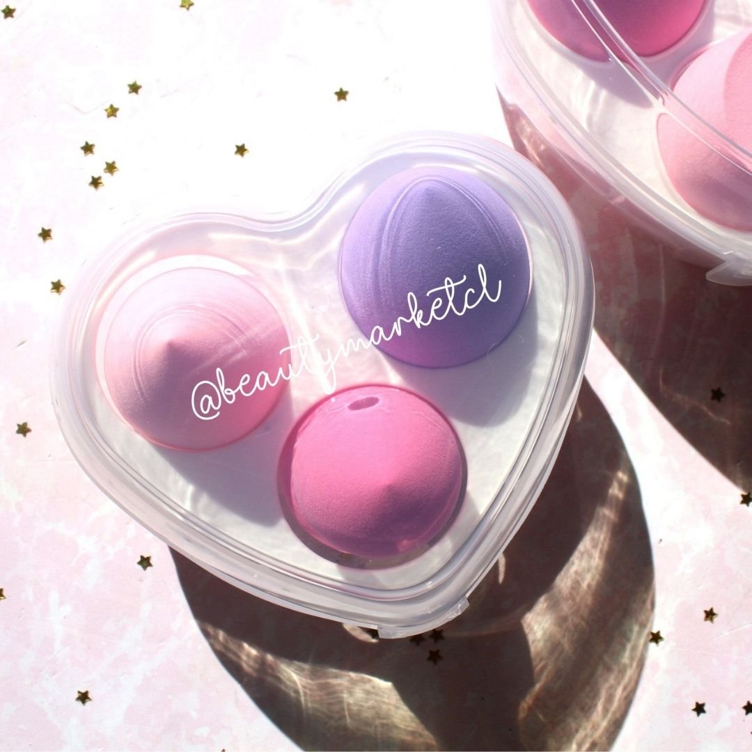 Set de 3 Esponjas con Estuche Corazón, contiene 3 esponjas para maquillaje surtidas.